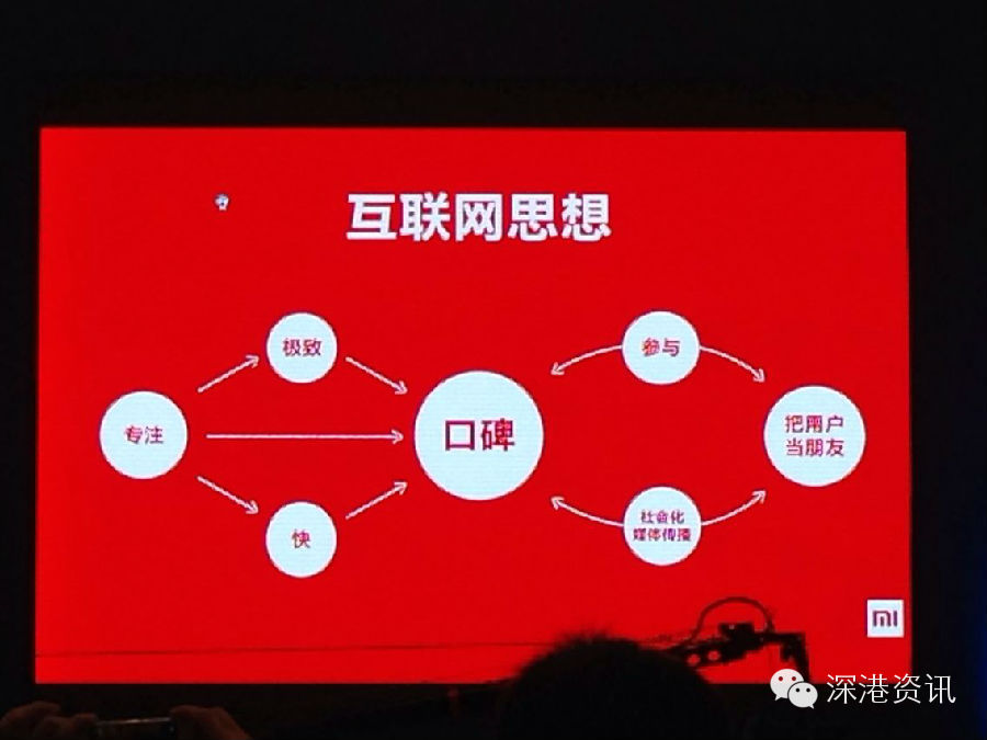 第二點很重要的原因,就是我們怎么用互聯(lián)網(wǎng)思想來做手機(jī);ヂ(lián)網(wǎng)思維這個詞最近很熱門,為什么?這一點我跟大家講,我參與創(chuàng)辦第一家公司是金山軟件,1988年創(chuàng)辦,互聯(lián)網(wǎng)在中國熱起來是1999年我們是被互聯(lián)網(wǎng)革命掉的第一代。互聯(lián)網(wǎng)最先吃掉跟他最近的行業(yè),軟件行業(yè)。被革命之后,我們開始想互聯(lián)網(wǎng)到底是什么?其實互聯(lián)網(wǎng)我們自己也用,但是為什么軟件行業(yè)受到這么大打擊?后來我一步一步理解,互聯(lián)網(wǎng)其實是全新的方法論。思考問題的方法完全不一樣。通過一步一步的思索,包括實踐,有一天我覺得他是一整套的東西,假如我們用這套東西做任何一個產(chǎn)品產(chǎn)業(yè),我覺得都能產(chǎn)生核爆炸。所以2010年我用這套方法做手機(jī)。很多人這個方法你是做想出來的嗎?整個方法做小米之前,已經(jīng)是成熟的。所以過去10多年互聯(lián)網(wǎng)企業(yè)實踐,其實摸索了很多方法。這張圖最最核心的是什么?是口碑。我記得80年代的時候,IBM談用戶滿意度。90年代微軟談用戶體驗。其實今天互聯(lián)網(wǎng)公司全部談用戶口碑。我們認(rèn)為沒有任何一種推廣形式比用戶口碑更重要。小米手機(jī)發(fā)布的時候,我同事拿了一個3500萬廣告預(yù)算給我看,我拿起來就把這個預(yù)算表撕了,我說我們能不能一分錢不花,我能不能相信用戶口碑能讓我們成為中國乃至世界性公司,我們就是用這種方法克制自己推廣。小米剛剛成立的一年半里,小米極其低調(diào),不做任何廣告,也沒有任何PR。甚至沒有人知道我們做什么。我們在2010年做系統(tǒng)的時候,第一個版本發(fā)出來,只有100個人用。第二個星期有200個人用。第三個星期有400個人用,不到一年時間,全球30萬人用。我說不做廣告,只有不做廣告才能真的測試清楚你的產(chǎn)品有沒有足夠口碑。
