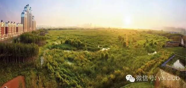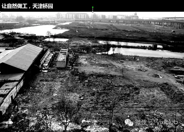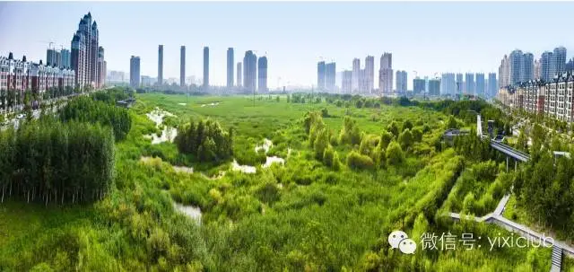 這是我們大概8年前在天津做的一個(gè)案例。這里有一塊污染很嚴(yán)重的叫城市棕地,棕色的棕,所謂的工業(yè)用地,原來是個(gè)打靶場,有污染的嚴(yán)重地,特別是鹽堿地很厲害,什么東西都長不出來,那么設(shè)計(jì)方法就是利用自然收集天上的雨水,像海綿一樣把雨水都留下來。