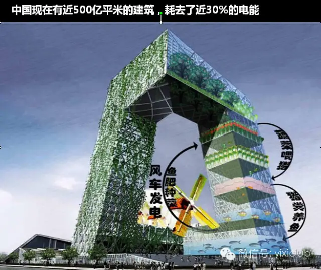 我剛才講了,中國現(xiàn)在有將近500億平方米的建筑,幾乎只有1%是節(jié)能的,絕大部分建筑都是不節(jié)能不環(huán)保的,這些建筑耗去了中國三分之一的電能,三分之一的電能都是因?yàn)殚_空調(diào),或者加溫、加濕,營造室內(nèi)環(huán)境,耗掉了中國的三分之一能源。這就是一幢典型的耗能建筑,我當(dāng)時(shí)建議他們做成立體養(yǎng)豬場最合適,上面養(yǎng)菜,中間養(yǎng)豬,底下養(yǎng)蘑菇、養(yǎng)魚。
