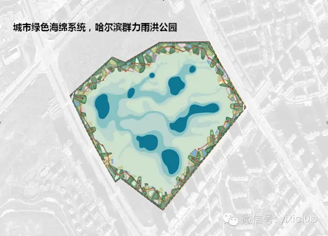 但是只有自然系統(tǒng)可以適應(yīng)自然的河渠,自然的水系統(tǒng)可以適應(yīng),所以城市應(yīng)該回歸海綿系統(tǒng),建立一個(gè)海綿的城市。這就是我三年前做的,叫海綿城市,城市中心一塊公園,你可以看到用了簡單的填挖方,做成一個(gè)海綿系統(tǒng)很簡單,就像我們的;~塘一樣,挖出來、做高,再挖出來、再做高,邊上做了一圈,這圈干嘛呢,就是用來凈化雨水,過濾雨水,使雨水從城市里頭往公園里頭排。
