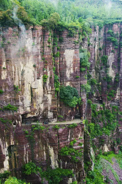 讓我們走到掛壁公路的對岸,就愈發(fā)能體會這雄壯奇?zhèn)サ那ж鸾^壁景觀了。