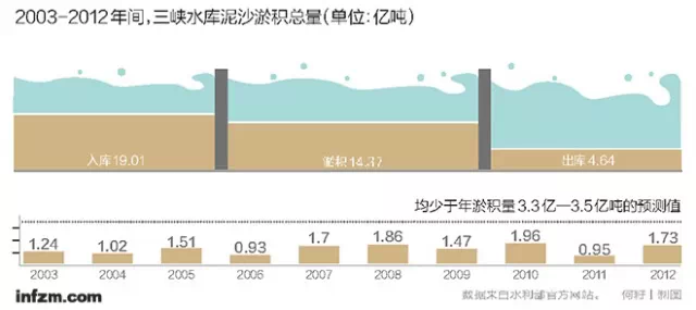 2003-2012年間,三峽水庫泥沙淤積總量(單位:億噸) (何籽/圖)點(diǎn)擊可查看大圖。