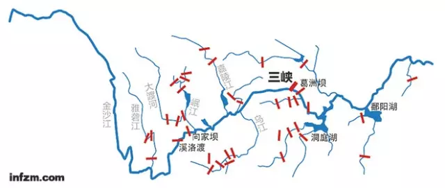 長江上游水電大躍進(jìn)成了三峽入庫泥沙減少的主因。圖中河流上的橫線為已建成或規(guī)劃中的大壩。根據(jù)公開資料整理。 (何籽/圖)