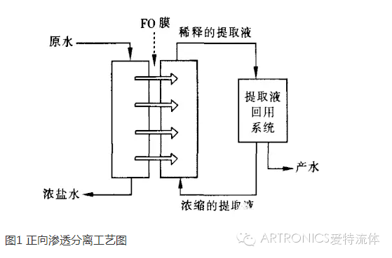 用只能透過(guò)溶劑而不能透過(guò)溶質(zhì)分子的半透膜將溶劑和溶液隔開(kāi),溶劑分子將在滲透壓的作用下自發(fā)地從溶劑側(cè)透過(guò)膜進(jìn)入溶液側(cè),這就是滲透現(xiàn)象,也即所謂的“正向滲透”。正向滲透膜分離工藝的流程見(jiàn)圖1。