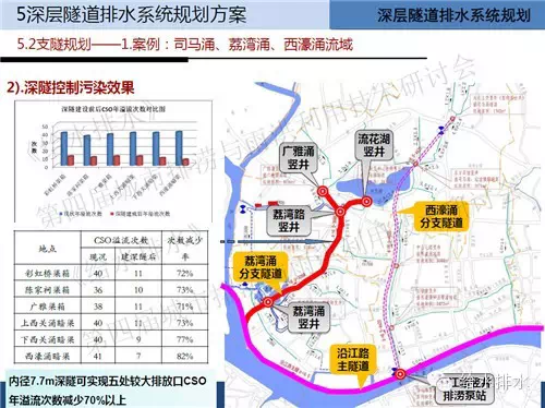 因?yàn)樯钏硌赝驹O(shè)有東風(fēng)路、中山三路、玉帶濠、沿江路4個(gè)入流井,可快速分流合流渠箱的雨水,減少進(jìn)入河涌的徑流量,降低河涌水位。同時(shí),隧道本身有約6.3萬立方米的調(diào)蓄容積,可對(duì)雨水徑流起到調(diào)蓄作用。另外,隧道尾端設(shè)有48立方米/秒的排澇泵站,暴雨時(shí)可進(jìn)行強(qiáng)排。