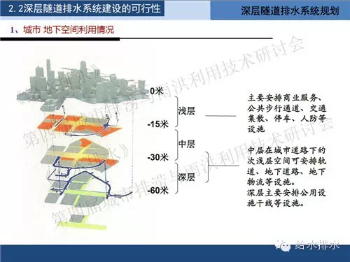- · “深隧”,即深層隧道排水系統(tǒng),來源于英文“deep tunnel”的直譯,是指埋設(shè)在深層地下空間(地下空間分為表層、淺層和深層,深層地下空間一般是指地面以下超過30米深度的空間)的大型排水隧道,直徑一般為3—10米。