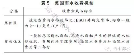 有條件的地區(qū)可以先行先試,借鑒歐美國(guó)家的雨水排水收費(fèi)機(jī)制(見表5),建立和完善雨水控制與收集系統(tǒng)建設(shè)與運(yùn)行的激勵(lì)(補(bǔ)償)與約束機(jī)制,鼓勵(lì)業(yè)主采取措施降低不透水面積和減少排入雨水管道系統(tǒng)的雨水徑流量。