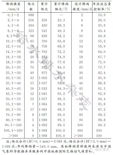 鑒于徑流系數(shù)指標(biāo)過(guò)于理論化,在實(shí)際應(yīng)用過(guò)程中不易操作。因此,通過(guò)將徑流系數(shù)的概念轉(zhuǎn)化為年徑流總量控制率,并通過(guò)年徑流總量控制率求得所對(duì)應(yīng)的設(shè)計(jì)雨強(qiáng)(mm/d),作為海綿城市建設(shè)的管控指標(biāo),以便于實(shí)際操作。