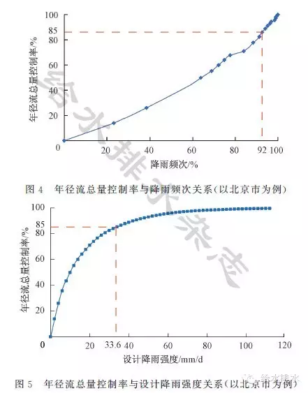 年徑流總量控制率是根據(jù)本地區(qū)自然狀況的徑流系數(shù)推算而得(年徑流總量控制率≈1-徑流系數(shù))。與之相對(duì)應(yīng)的設(shè)計(jì)雨強(qiáng),是經(jīng)過(guò)統(tǒng)計(jì)分析當(dāng)?shù)氐亩嗄辏ㄒ话悴簧儆?/span>30年)降雨資料,將日降雨量由小到大進(jìn)行排序(扣除小于等于2 mm的降雨事件),推導(dǎo)出年徑流總量控制率所對(duì)應(yīng)的設(shè)計(jì)雨強(qiáng)(mm/d),并以此作為海綿城市規(guī)劃、建設(shè)和管理的控制性指標(biāo)。以北京建筑大學(xué)對(duì)北京市的年徑流總量控制率與設(shè)計(jì)雨強(qiáng)的關(guān)系推導(dǎo)為例,北京市位于半濕潤(rùn)地帶,原始徑流系數(shù)約0.15,年徑流總量控制率為85%,對(duì)應(yīng)的設(shè)計(jì)雨強(qiáng)為33.6 mm/d,大約由小至大降雨排序的92%頻次的降雨控制不外排,即可達(dá)到海綿城市的建設(shè)目標(biāo)要求(如表2和圖4、圖5所示)。