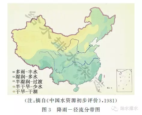 徑流系數(shù)是表征水文特征的重要參數(shù),是自然狀態(tài)下地表徑流量與總降雨量的比值,與自然地理氣候狀況有直接關(guān)系。依據(jù)多年水文氣象資料,我國(guó)降雨-徑流分布規(guī)律可劃分為5個(gè)區(qū)(如表1和圖3所示),大致反映了各個(gè)區(qū)域的自然水文生態(tài)特征。