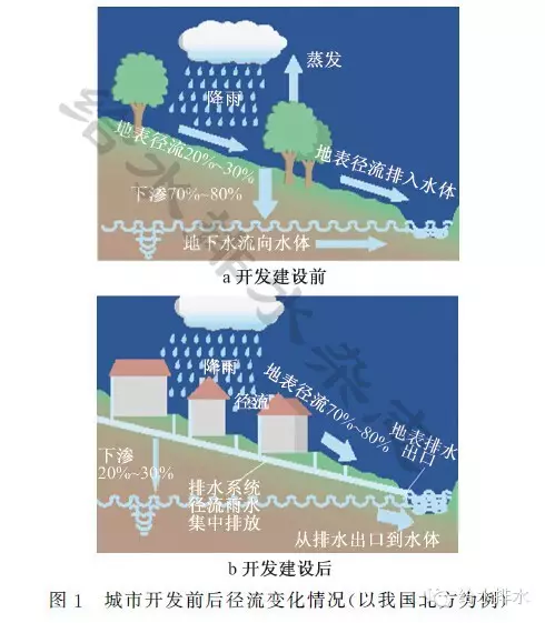 快速城鎮(zhèn)化建設(shè)過(guò)程中,由于城市開發(fā)強(qiáng)度過(guò)高,大量的硬質(zhì)鋪裝,改變了原有的自然生態(tài)本底和水文特征。以我國(guó)北方為例,城市開發(fā)建設(shè)前,在自然地勢(shì)地貌的下墊面條件下,70%~80%的降雨可以通過(guò)自然滯滲進(jìn)入地下,涵養(yǎng)了本地的水源和生態(tài),只有20%~30%的雨水形成徑流外排(見圖1a);而城市開發(fā)建設(shè)后,由于屋面、道路、地面等設(shè)施建設(shè)導(dǎo)致的下墊面硬化,70%~80%的降雨形成徑流,僅有20%~30%的雨水能夠入滲地下(見圖1b),破壞了自然生態(tài)本底,呈現(xiàn)了相反的水文特征,破壞了自然“海綿體”,導(dǎo)致“逢雨必澇、雨后即旱”,也帶來(lái)了水生態(tài)惡化、水資源緊缺、水環(huán)境污染、水安全缺乏保障等一系列問(wèn)題。