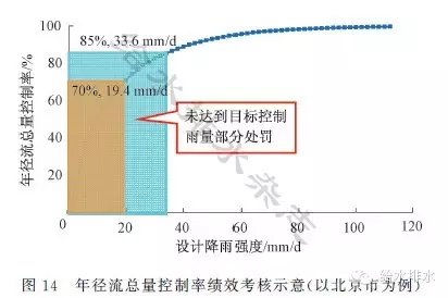 將年徑流總量控制率、水環(huán)境質(zhì)量狀況、排水防澇標(biāo)準(zhǔn)、污水再生利用及雨水利用、漏損控制等作為海綿城市建設(shè)的績(jī)效考核目標(biāo),考核結(jié)果可作為財(cái)政獎(jiǎng)補(bǔ)的依據(jù)。以年徑流總量控制率對(duì)應(yīng)的降雨強(qiáng)度作為地塊徑流控制是否達(dá)標(biāo)的衡量標(biāo)準(zhǔn),通過(guò)區(qū)域總排口的連續(xù)監(jiān)測(cè),對(duì)于未達(dá)到目標(biāo)控制雨量的部分進(jìn)行處罰(如圖14所示)。此外,不同考核地塊之間,也可研究建立年徑流控制量的平衡和交易機(jī)制,鼓勵(lì)公平分擔(dān)、獎(jiǎng)優(yōu)罰劣。