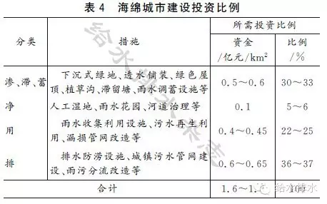綜合各地已開展的低影響開發(fā)建設(shè)項(xiàng)目的實(shí)踐,估算海綿城市建設(shè)投資為1.6~1.8億元/km2,見表4。