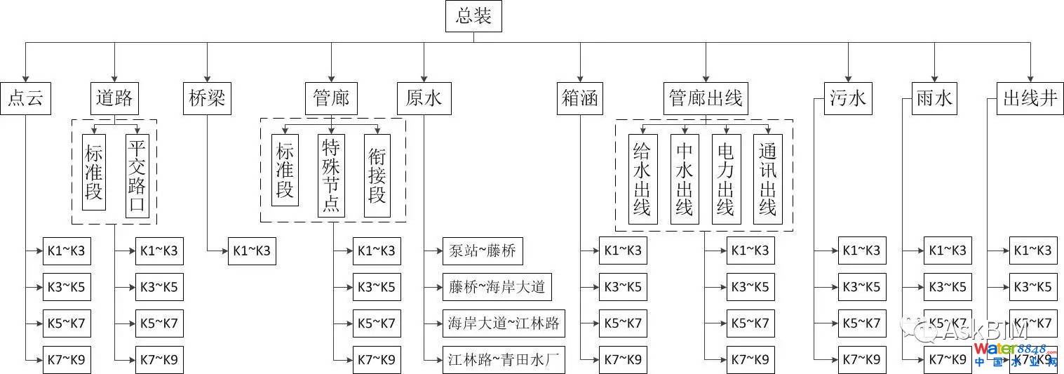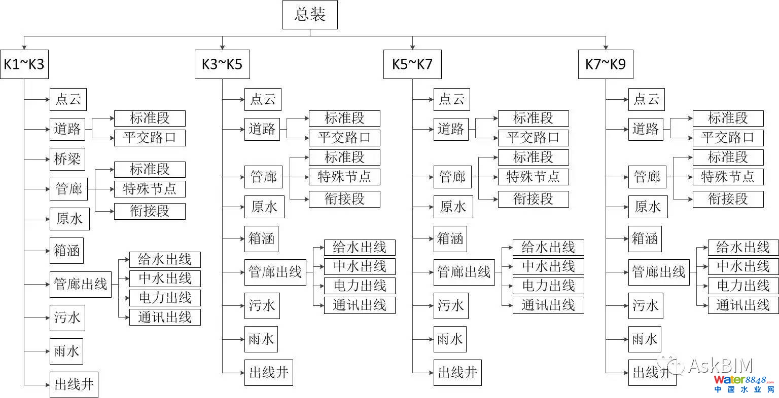 本次建模針對道路工程、原水工程、綜合管廊工程、廊內(nèi)管線出線(電力、通訊、中水、給水、廊內(nèi)集水池)、橋涵工程、雨水工程、污水工程。針對綜合管廊的節(jié)點(diǎn)進(jìn)行建模(廊內(nèi)管線、預(yù)留預(yù)埋、消防、支吊架、支墩、廊內(nèi)排水),建模范圍K1+774~K9+424.4。