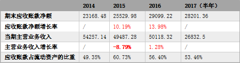 通過(guò)分析2017年招股說(shuō)明書發(fā)現(xiàn),近三年,應(yīng)收賬款余額占到公司流動(dòng)資產(chǎn)的比例平均達(dá)到一半以上,應(yīng)收賬款的增速較快,大于同期主營(yíng)業(yè)務(wù)收入的增速(見表3)。