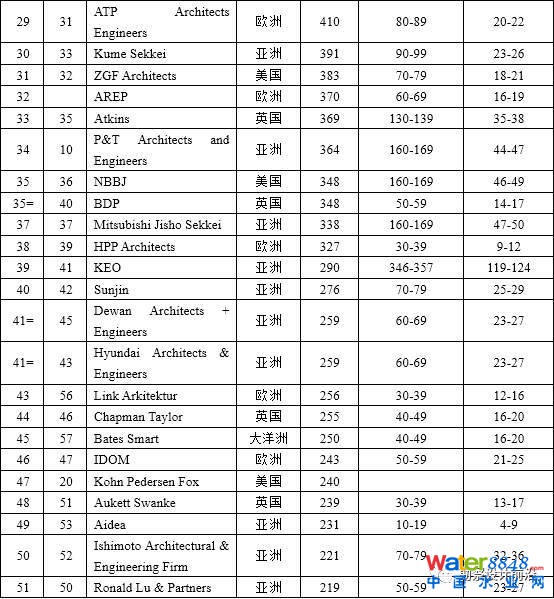 說(shuō)到這,大家可能會(huì)感到奇怪,怎么中國(guó)大陸的建筑設(shè)計(jì)院一家都沒有呢,中國(guó)建筑設(shè)計(jì)院,中建系的建筑設(shè)計(jì)院,上海現(xiàn)代等,都沒上榜嗎?實(shí)際不是這樣。話說(shuō)這個(gè)排名是英國(guó)的老牌建筑刊物BD統(tǒng)計(jì)的,可能是由于這個(gè)固執(zhí)的英國(guó)佬,每年調(diào)查的公司范圍比較固定,仍然局限于傳統(tǒng)英美國(guó)家,不僅榜上英國(guó)、美國(guó)公司居多,它設(shè)定的“中國(guó)”公司,也總是凱達(dá)(Aedas,第9)、巴馬丹拿(P+T Architects & Engineers,第34)、呂元祥事務(wù)所(Ronald Lu & Partners,第51)和王董(Wong Tung & & Partners,第60)和劉榮廣與伍振民建筑師事務(wù)所(Dennis Lau & Ng Chun Man Architects & Engineers,第61)這幾家出身香港的老面孔。也許他們對(duì)沒有歐美背景或并非私人經(jīng)營(yíng)的企業(yè)還陌生得很?而中國(guó)的設(shè)計(jì)機(jī)構(gòu)可能還需要時(shí)間獲得世界的了解和尊重。