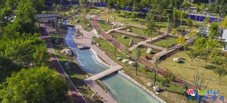 3.水系景觀改造:將原來水體硬質駁岸改建為生態(tài)型水系,循環(huán)暢通提升水質;增設棧道、更新盛世古鼎、改造公廁及其他基礎設施,提升景觀品質;增設下沉式綠地、植草溝、雨水花園、透水鋪裝、雨水回用設施等海綿設施,實現(xiàn)地塊雨水滯蓄、凈化、收集和超量外排。
