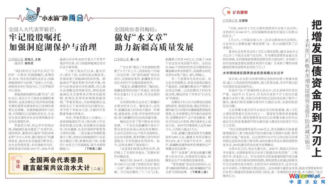 今年全國兩會期間,中國水利報就加強洞庭湖保護與治理的相關(guān)建議專訪全國人大代表,湖南省水利廳黨組書記、廳長羅毅君,于3月8日在報紙頭版《“小水滴”跑兩會》專題刊發(fā)此文。