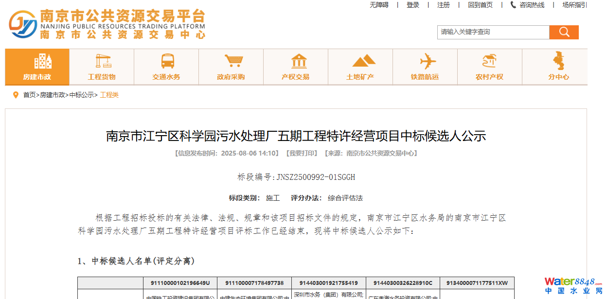 超 10 億!南京江寧科學(xué)園污水處理廠五期工程特許經(jīng)營項(xiàng)目中標(biāo)候選人公示,中鐵、中建等央企國企入圍