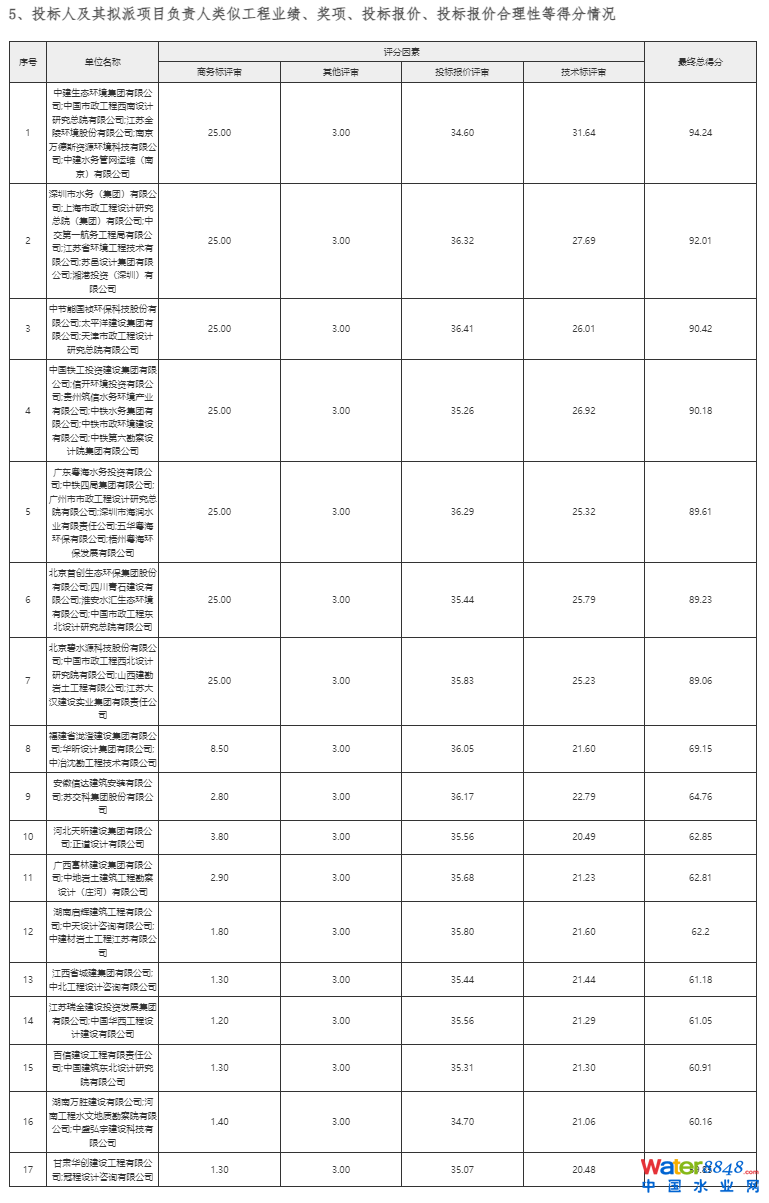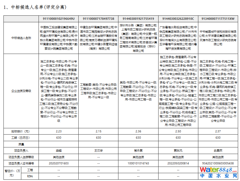 中標(biāo)候選人名稱:中國鐵工投資建設(shè)集團(tuán)有限公司、信開環(huán)境投資有限公司、貴州筑信水務(wù)環(huán)境產(chǎn)業(yè)有限公司、中鐵水務(wù)集團(tuán)有限公司、中鐵市政環(huán)境建設(shè)有限公司、中鐵第六勘察設(shè)計(jì)院集團(tuán)有限公司;