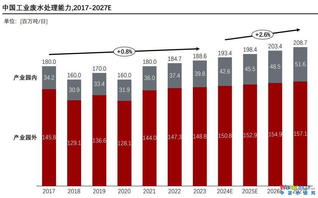 產(chǎn)業(yè)園內(nèi)工業(yè)廢水處理能力在2023年占比為21.1%,而2017年為19.0%,預計到2027年該比例將增至24.79%。