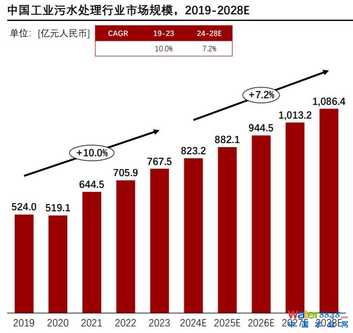 2023年中國工業(yè)污水處理行業(yè)市場規(guī)模為767.5億元人民幣,行業(yè)規(guī)模自2020年以來逐年攀升,2019-2023年均復合增長率為10.0%,預計2024年市場將持續(xù)增長至823.2億元人民幣。