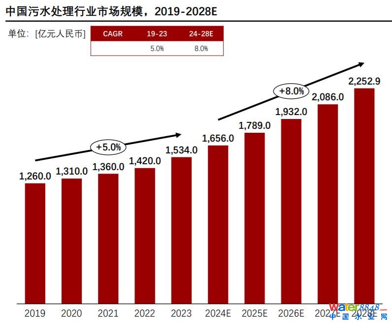 預計2024-2028年,污水處理市場規(guī)模逐年遞增,并在2028年達到2,252.9億元人民幣,年均復合增長率為8%。