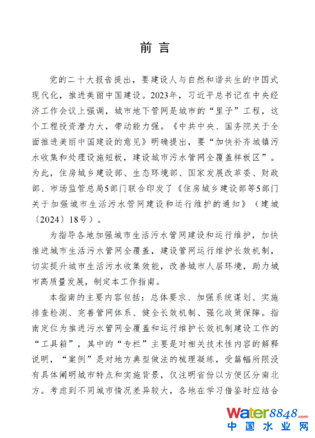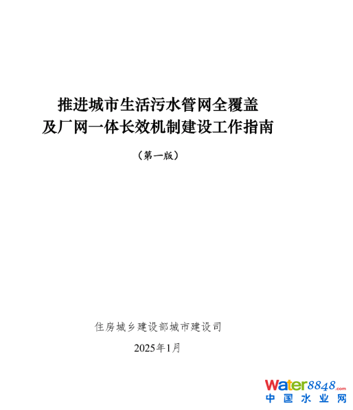 為落實黨中央、國務(wù)院有關(guān)工作部署,加快推進城市生活污水管網(wǎng)全覆蓋,建立健全污水管網(wǎng)建設(shè)運維長效機制,切實提升城市生活污水收集效能,我們組織編制了《推進城市生活污水管網(wǎng)全覆蓋及廠網(wǎng)一體長效機制建設(shè)工作指南(第一版)》,現(xiàn)印發(fā)給你們,請結(jié)合實際參照執(zhí)行。
